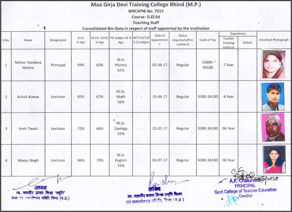Maa Girja Devi Training College, Bhind, Madhya Pradesh Recognized by National Council for Teacher Education for D.El.Ed. programme has been founded with motto to provide higher education to boys and girls of Bhind District.