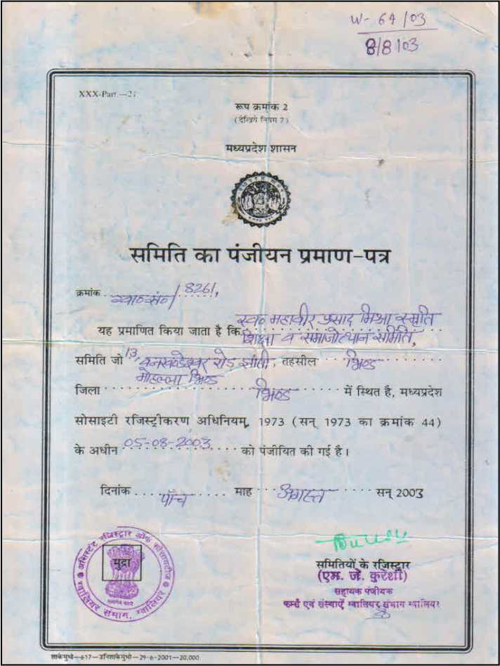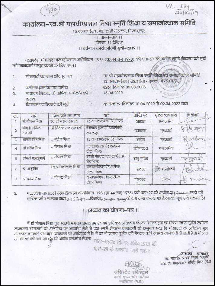 13, VANKHANDESHWAR ROAD, BHIND - 477001 (MADHYA PRADESH)